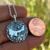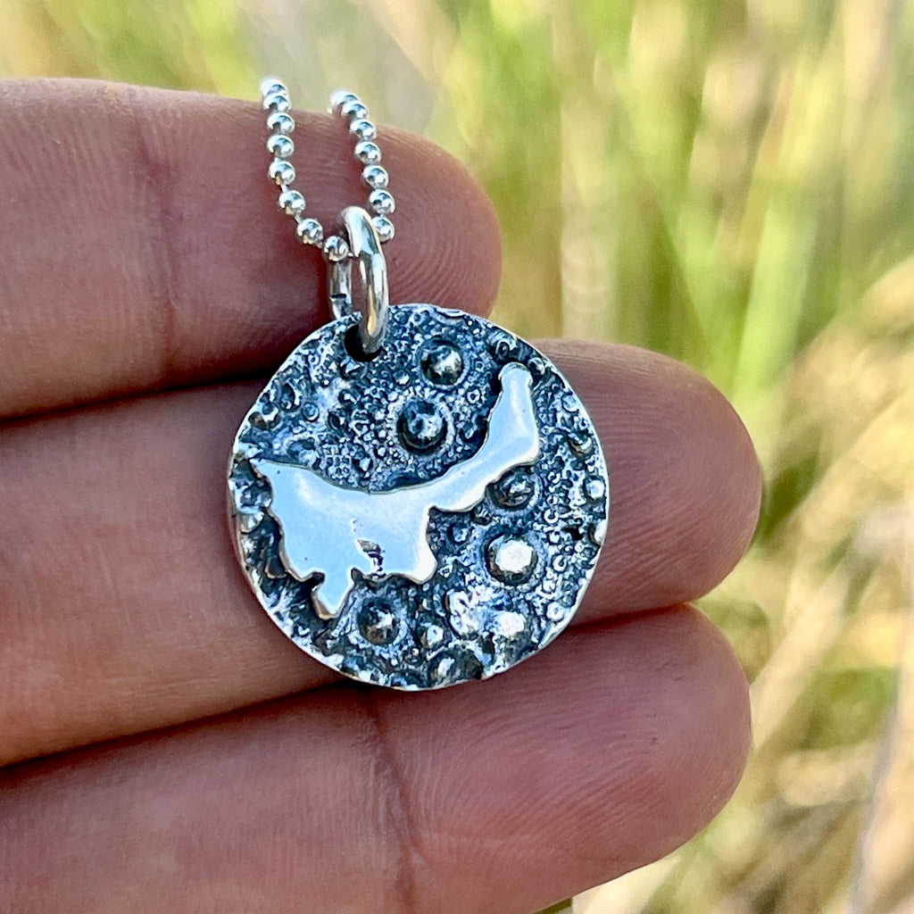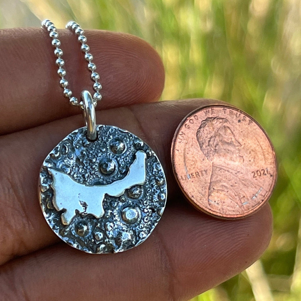 This pendant measures 19mm and comes with an 18” Sterling Silver ball chain.